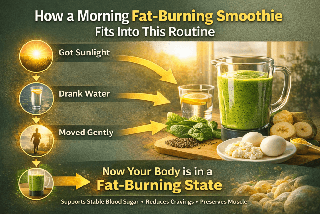 If you’ve already gotten sunlight, hydrated, moved gently, and started your day calmly, your body is now in a low-stress, fat-burning state. This is the ideal moment to fuel yourself with a nutrient-dense smoothie rather than a high-sugar breakfast or skipping food altogether.