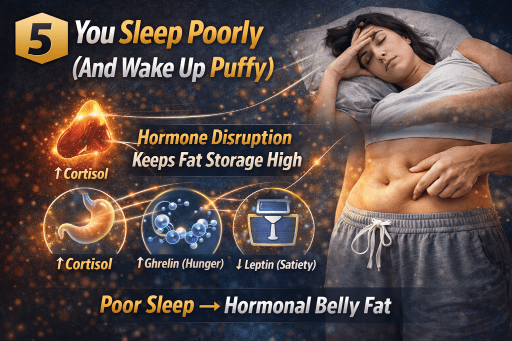 If you wake up puffy or bloated, it’s often a stress + sleep issue, not a calorie issue.