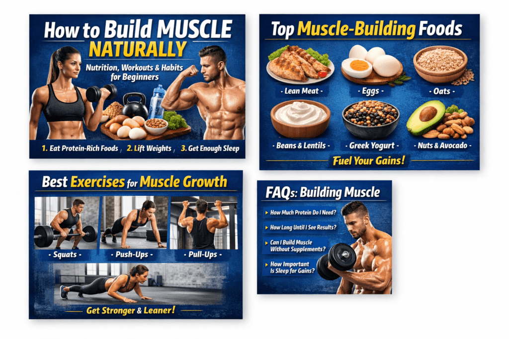 Protein-rich foods (eggs, chicken, beans), carbs (rice, oats, fruit), and healthy fats (nuts, avocado) work together to support muscle growth.