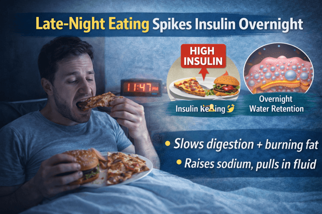 Large late meals—especially refined carbs and salty foods—keep insulin elevated while you sleep.