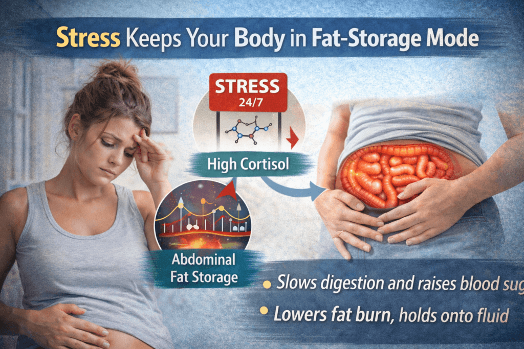 Stress hormones, poor sleep, unstable blood sugar, gut inflammation, and dehydration can all cause your body to retain fluid, slow digestion, and cling to fat around your midsection.